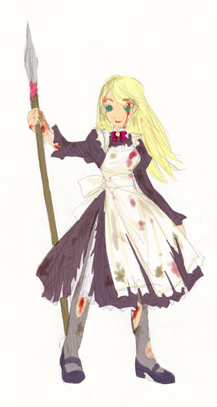 とまあ、それはともかく。このメイドさんは戦ってるので武器を持ってます。そしてボロボロです。しかし、なぜ武器がこんな粗末な槍なんだとか、清々しいほど誇らしげな表情の理由とかは全く考えていません。そもそも、なんでメイドがこんな血まみれになるまで戦ってるんだろう?