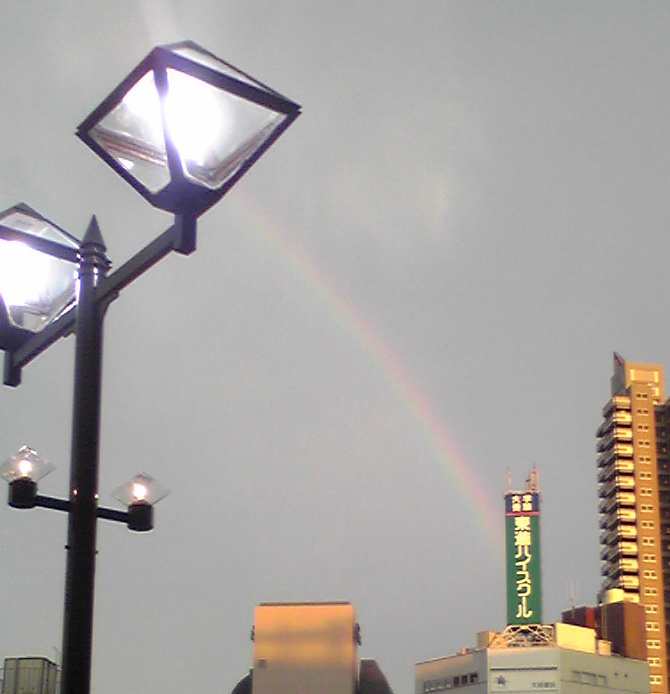 虹が。ちなみに、雨が降った形跡は全くありませんでした。周りの人も、「あれ?雨降ってないよね」的な事話してたし。普通、虹って雨の後に出る物ですよね?だから、念のためこの記事書く前に気象庁のアメダスを見てどこかで雨が降っていなかったか調べたのですが、雨が降ったというデータは浦和近辺、というか東京等でも見当たらず。これは、アメダス計測範囲外のどこかで雨が降ったのでしょうか?(でも、どこか一カ所くらい記録があっても良いような)謎です。